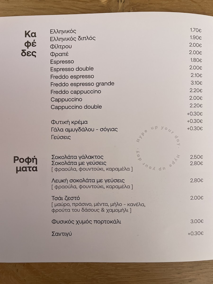 The café focuses on quality coffee, offering a carefully curated menu that caters to every palate. Among their standout offerings is the classic Espresso (€2.00), which is the hero of their coffee repertoire—crafted with precision and served steaming, it’s an invigorating way to kickstart your day. If you prefer something a bit cooler, their Frappe (€2.20), a Greek favorite, promises to refresh you with every sip, blending the laid-back spirit of summer into a delightful coffee experience.